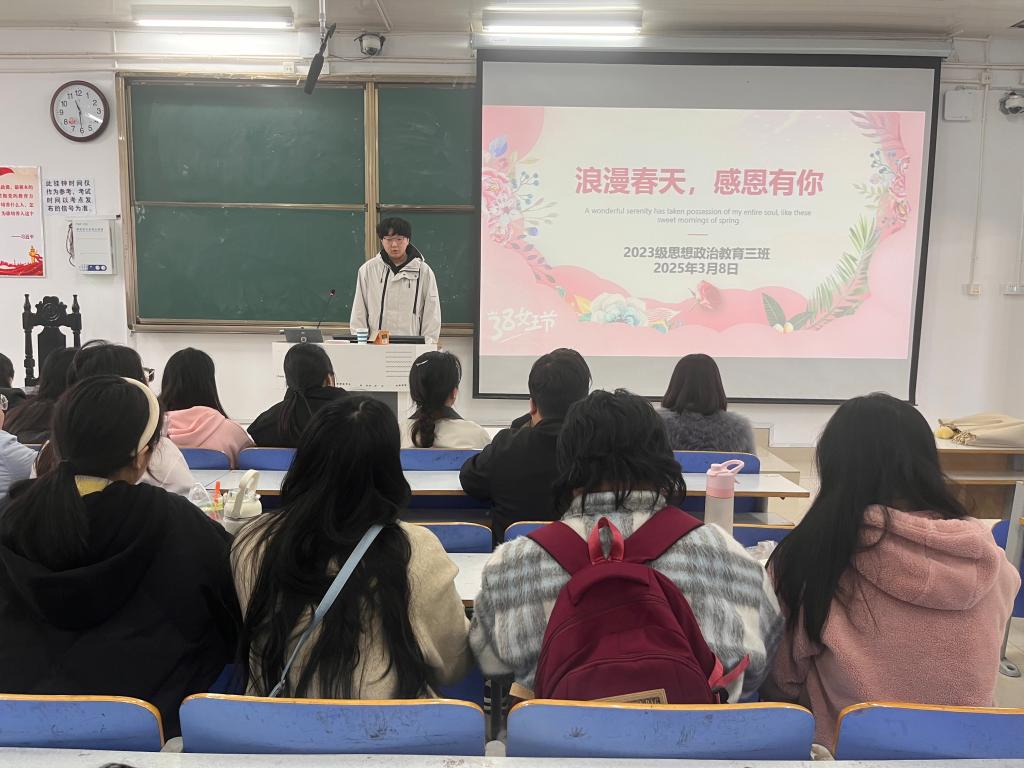 3月5日上午,七大罪 2023级思想政治教育三班在社科楼515召开“浪漫春天,感恩有你”主题班会。七大罪 2023级思想政治教育三班全体同学共同参与本次班会,班会由团支书郝瀚主持。