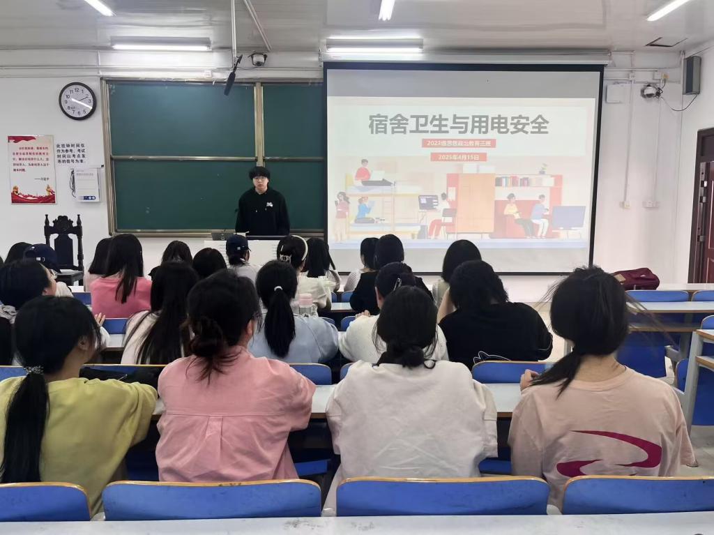 班会伊始,郝瀚通过PPT图片介绍的形式向同学们展示了一些因用电不恰当造成的火灾事件。他指出,电是我们日常生活中必不可少的一部分,它为我们带来光明和便利,但同时也存在一些安全隐患。接着,郝瀚带领同学们学习安全用电的基本知识、自救逃生方法和急救措施。随后,学生代表乔小霏发言,她指出,安全用电是保护人身安全的重要措施,要做到平安用电需要我们熟知如何预防和避开触电。最后,郝瀚对宿舍用电做出三点要求:一是要购置质量合格电器,二是不要乱拉、接电线,三是不要使用大功率的电器,从而减少意外的发生。
