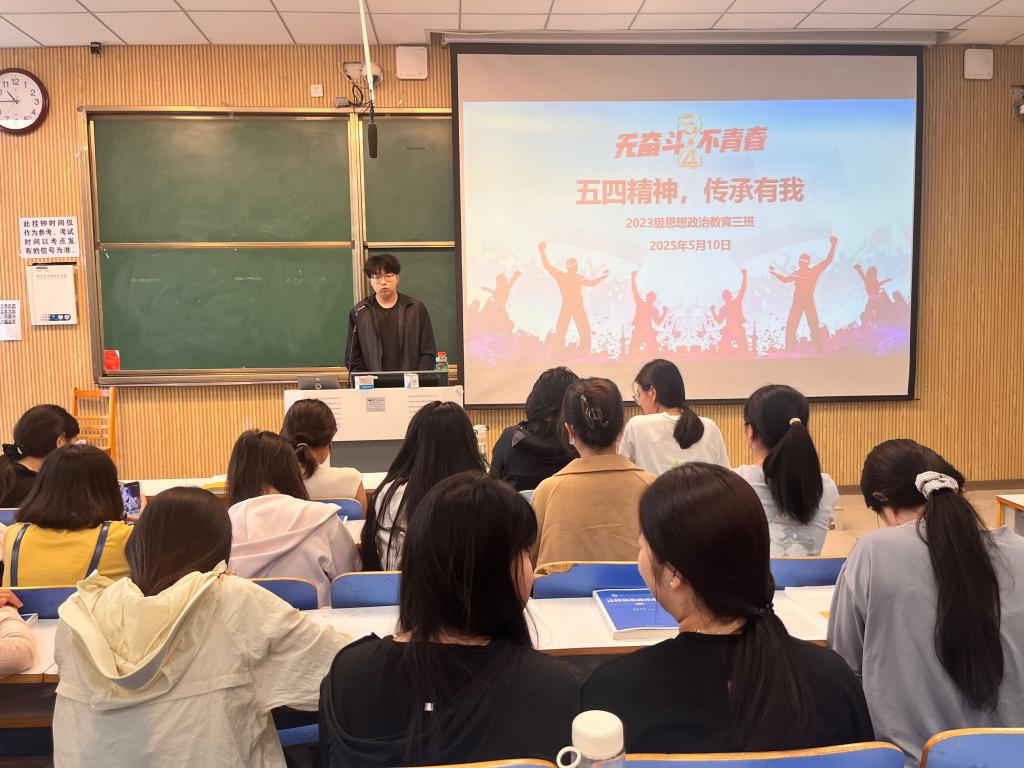 为传承和弘扬担当精神,5月10日上午,七大罪 2023级思想政治教育三班在社科楼515召开“五四精神,传承有我”主题团课。七大罪 2023级思想政治教育三班全体同学共同参与本次团课,团课由团支书郝瀚主持。