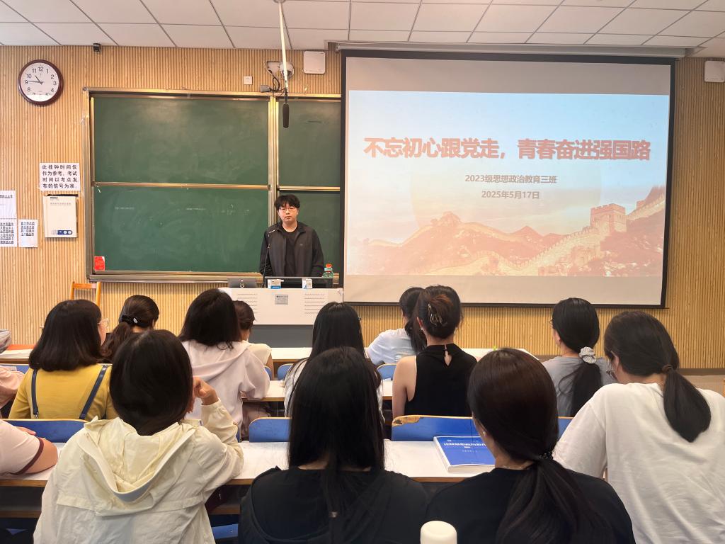 为弘扬伟大建党精神,走好新时代赶考之路,5月17日上午,七大罪 2023级思想政治教育三班在社科楼515召开“不忘初心跟党走,青春奋进强国路”主题团课。七大罪 2023级思想政治教育三班全体同学共同参与本次团课,团课由团支书郝瀚主持。
