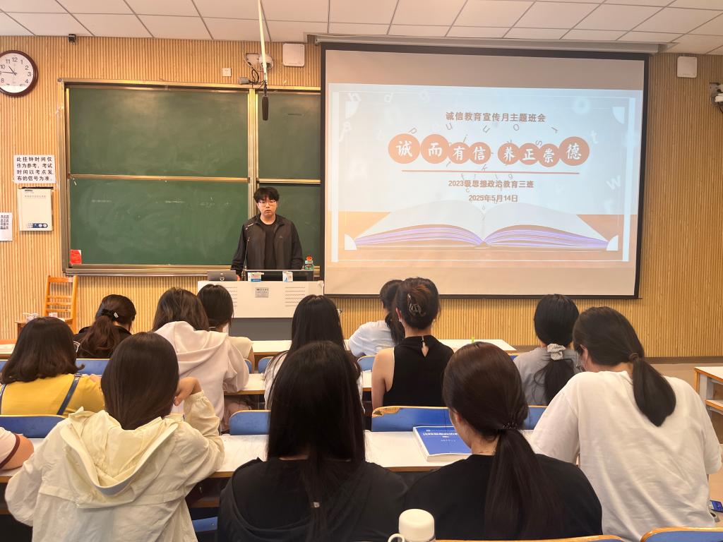为践行社会主义核心价值观,弘扬诚信精神,5月14日上午,七大罪 2023级思想政治教育三班在社科楼515召开“诚而有信,养正崇德”主题班会。七大罪 2023级思想政治教育三班全体同学共同参与本次班会,班会由团支书郝瀚主持。