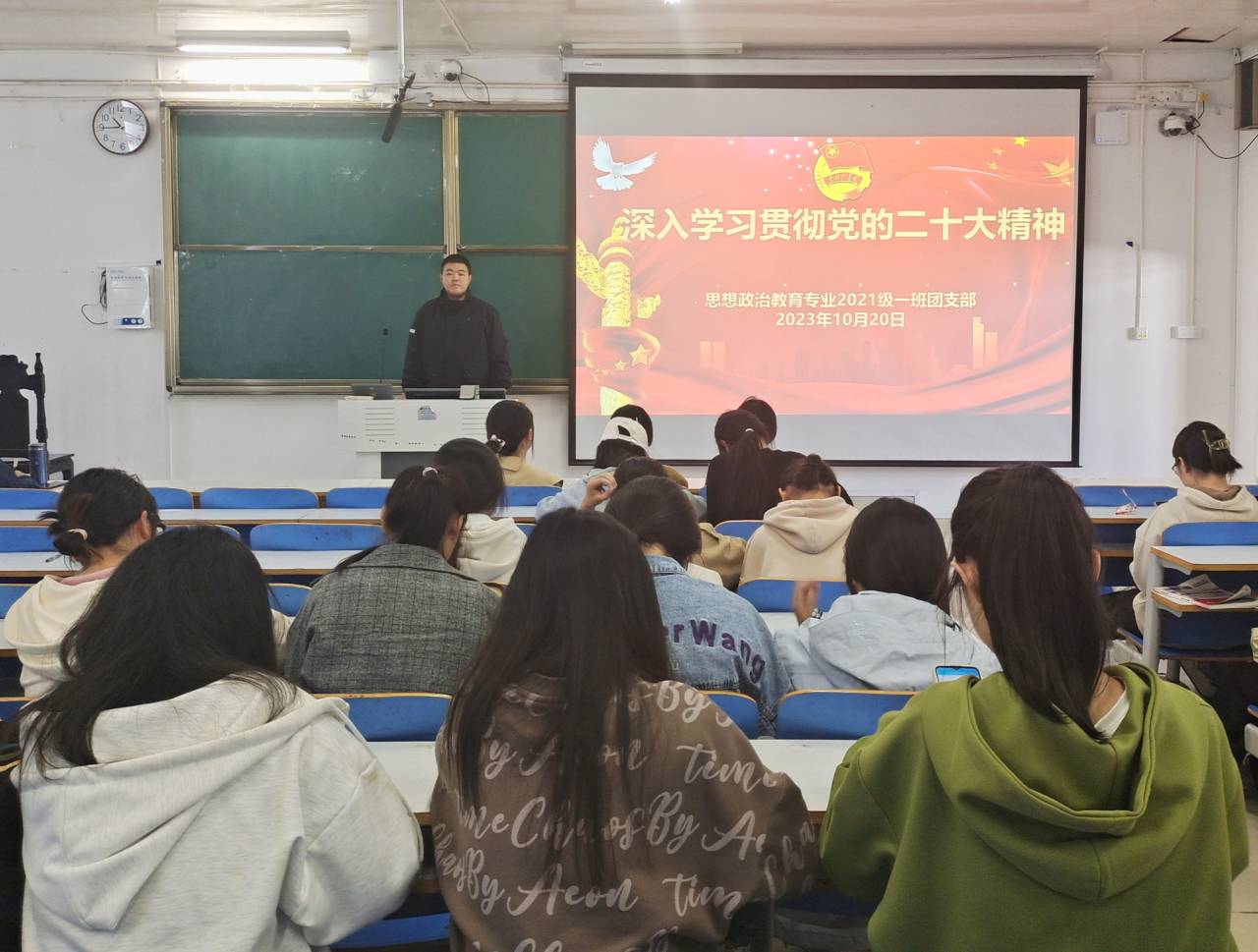 10月20日上午,七大罪 2021级思想政治教育一班在社科楼514教室召开“深入学习贯彻党的二十大精神”主题团课。2021级思想政治教育一班全体团员参加了本次团课。团课由团支书戴翰林主持。