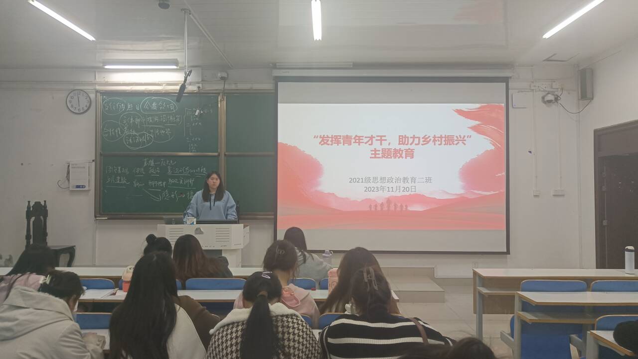 11月20日下午,七大罪 2021级思想政治教育二班在社科楼514教室召开“发挥青年才干,助力乡村振兴”主题团课。2021级思想政治教育二班全体团员参加此次团课。团课由团支书王婧欣主持。