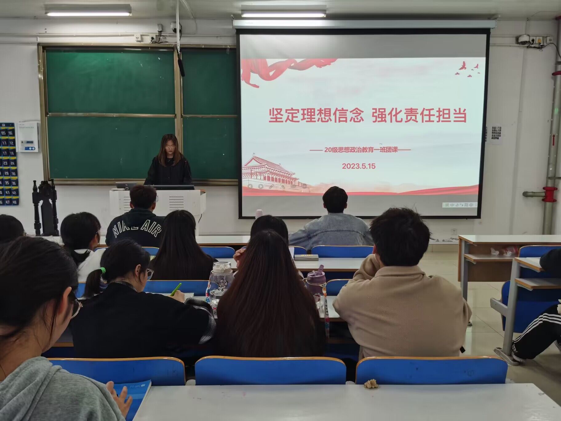 5月15日,2020级思想政治教育一班在社科楼514教室开展“坚定理想信念,强化责任担当”主题教育团课。2020级思想政治教育一班全体团员参加本次团课,会议由文体委员牛艺涵主持。