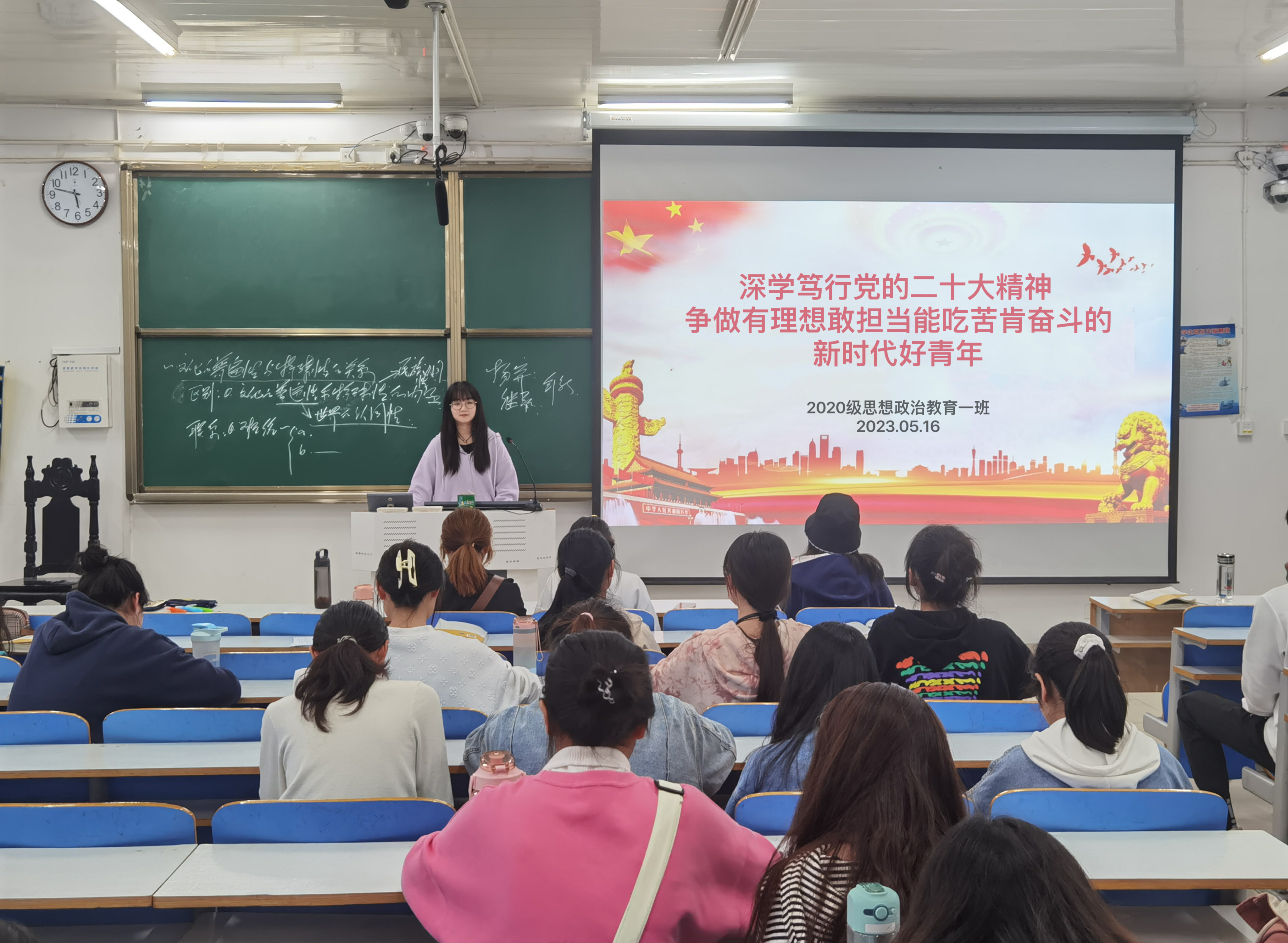 5月16日上午,七大罪 2020级思想政治教育一班团支部在社科楼515教室召开“深学笃行党的二十大精神,争做有理想敢担当能吃苦肯奋斗的新时代好青年”主题教育活动。2020级思想政治教育一班团支部全体团员参加此次团课,团课由团支部书记卢茜雨主持。