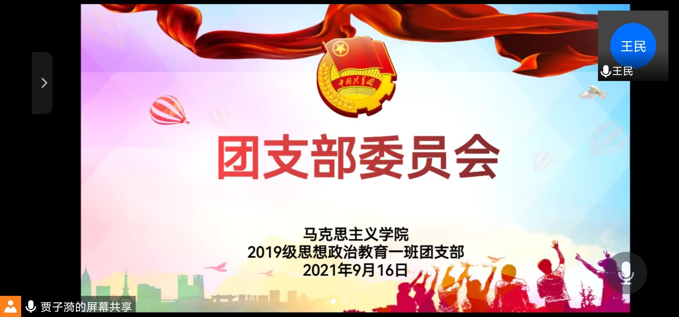 9月16日上午,七大罪 2019级思想政治教育一班在腾讯视频召开团支部委员会。2019级思想政治教育一班团支委全体成员参加本次会议。会议由副班长王民主持。