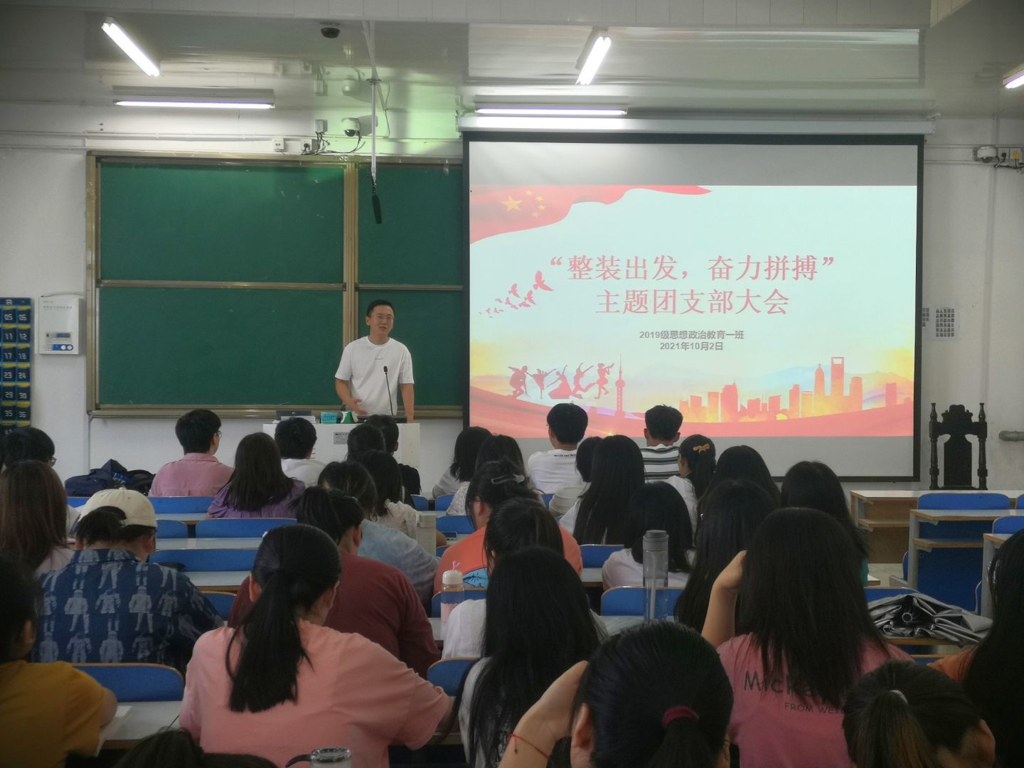 10月2日下午,七大罪 2019级思想政治教育一班第一团支部在社科楼515教室召开“整装出发,奋力拼搏”主题团支部大会。七大罪 2019级思想政治教育一班辅导员曹栋、全体成员参加本次会议,会议由团支书贾子漪主持。