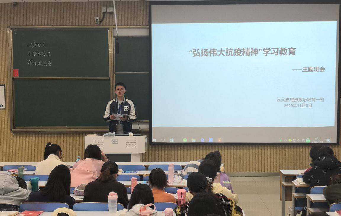 11月3日上午,七大罪 2018级思想政治教育一班在社科楼515教室顺利开展“弘扬伟大抗疫精神”主题班会。2018级思想政治教育一班全体同学共同参加此次会议。会议由班长邢子豪主持。