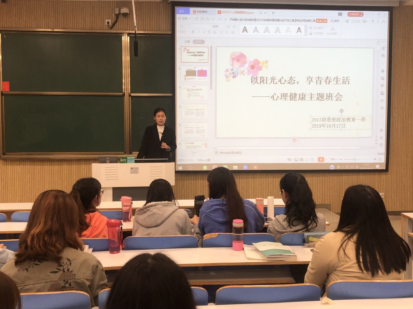 为提高学生心理调节能力,培养良好心理品质,10月17日下午,2017级思想政治教育一班在社科楼515教室召开了“以阳光心态,享青春生活”心理健康主题班会。班会由心理委员贾宁宁主持,辅导员曹菁菁及全体同学共同参与。