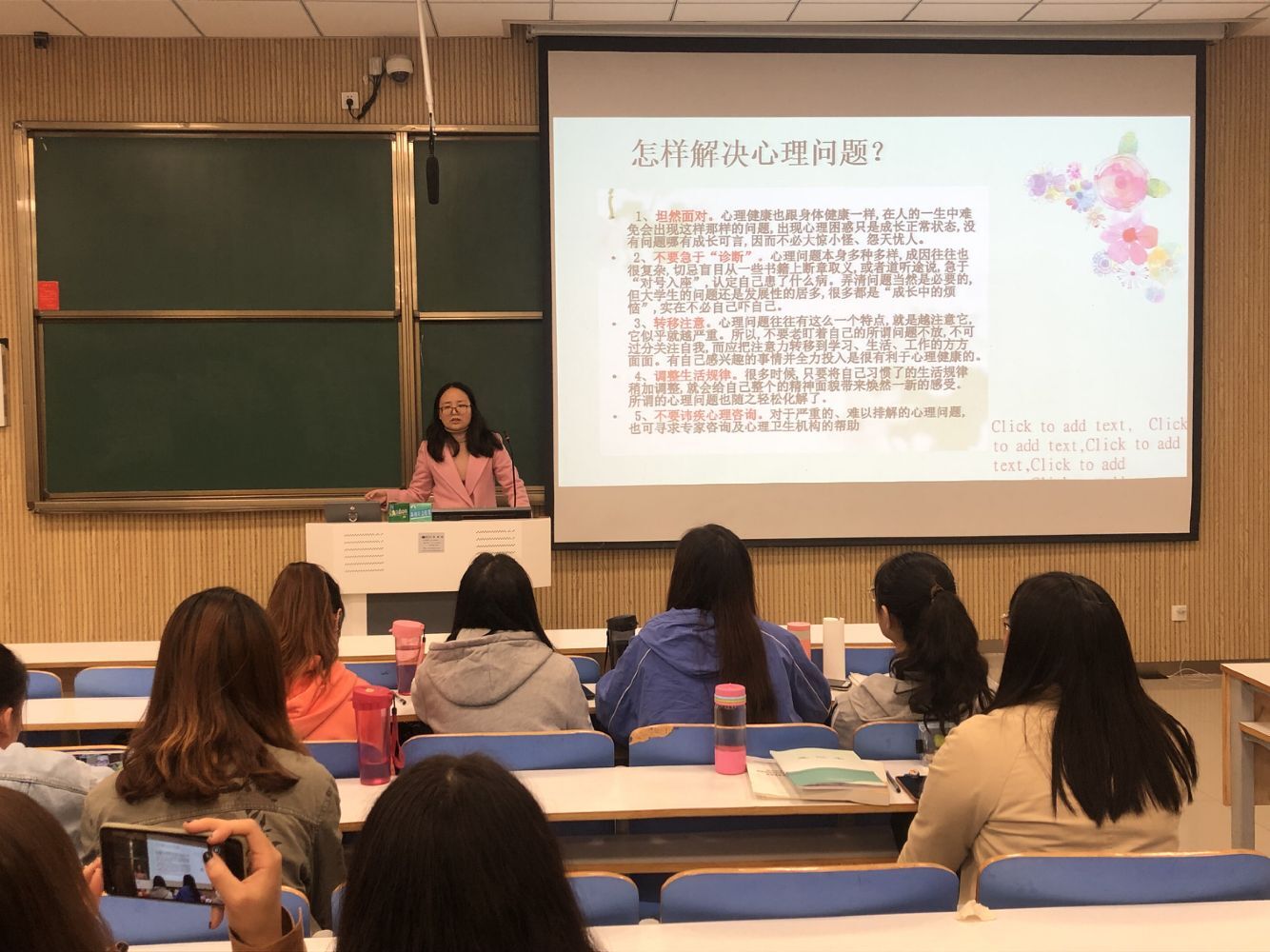 班会通过PPT解说、播放视频、学生代表发言等形式展开,内容主要从学习问题、人际交往问题、性格与情绪问题、神经质问题四方面出发,学生代表耿海利为大家介绍了学习小妙招,缓解大家复习压力。贾宁宁为大家整理了多个解决心理压力的方法,她指出要正确处理心理问题,养成良好生活习惯,自觉调整生活规律,转移注意力。辅导员曹菁菁总结发言,她表示同学们要形成正确的学习习惯,不要施加太多心理压力,在学习之余要注重身体健康,多锻炼,形成良好体魄。