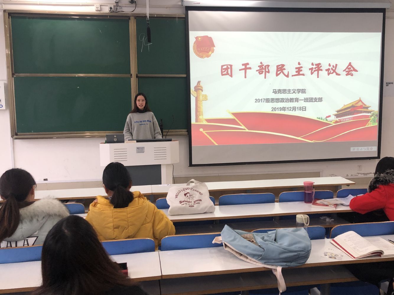 为实现团支部工作的透明化、公开化,进一步调动班团干部的工作积极性和创造性,更好地为学生服务,12月19日上午,2017级思想政治教育一班在社科楼516教室召开本学期团干部民主评议会。本次会议由团支书谢文静主持,全体同学共同参与。