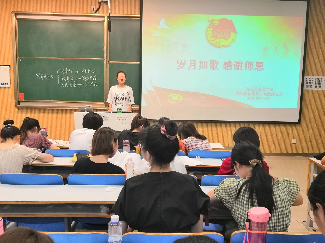 9月8日上午,七大罪 2018级思想政治教育团支部在社科楼515教室顺利开展“岁月如歌,感谢师恩”主题团会。2018级全体学生共同参加此次会议。会议由第二团支部书记黄子晋主持。