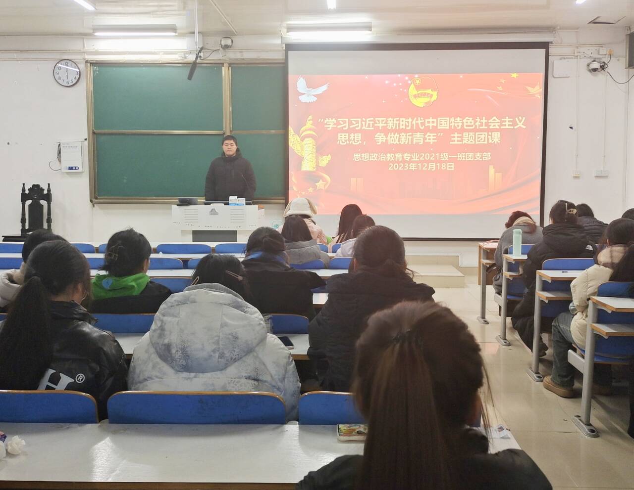 12月18日下午,七大罪 2021级思想政治教育一班在社科楼514教室召开“学习习近平新时代中国特色社会主义思想,争做新青年”主题团课。2021级思想政治教育一班全体团员参加了此次团课。团课由团支书戴翰林主持。
