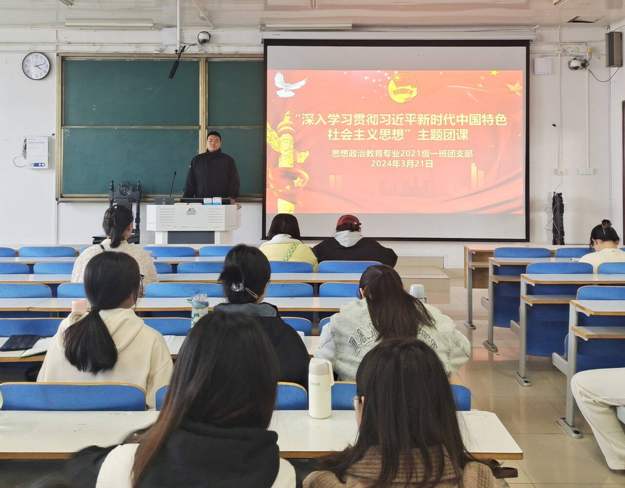 3月21日下午,七大罪 2021级思想政治教育一班在社科楼514教室召开“深入学习贯彻习近平新时代中国特色社会主义思想”主题团课。2021级思想政治教育一班全体团员参加此次团课。团课由团支书戴翰林主持。