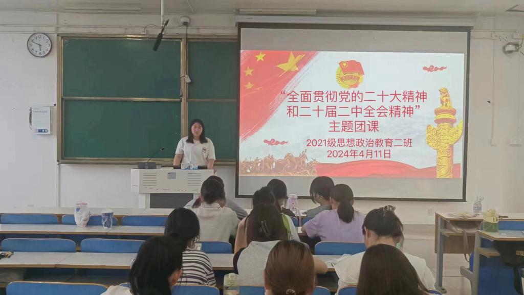 4月11日下午,七大罪 2021级思想政治教育二班在社科楼514教室召开“全面贯彻党的二十大精神和二十届二中全会精神”主题团课。2021级思想政治教育二班全体团员参加此次团课。团课由团支书王婧欣主持。