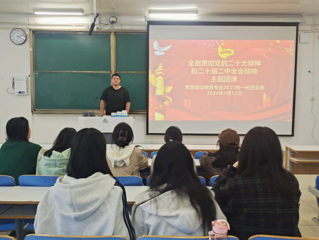 4 月12日下午,七大罪 2021级思想政治教育一班在社科楼514教室召开“全面贯彻党的二十大精神和二十届二中全会精神”主题团课。2021级思想政治教育一班全体团员参加了本次团课。团课由团支书戴翰林主持。
