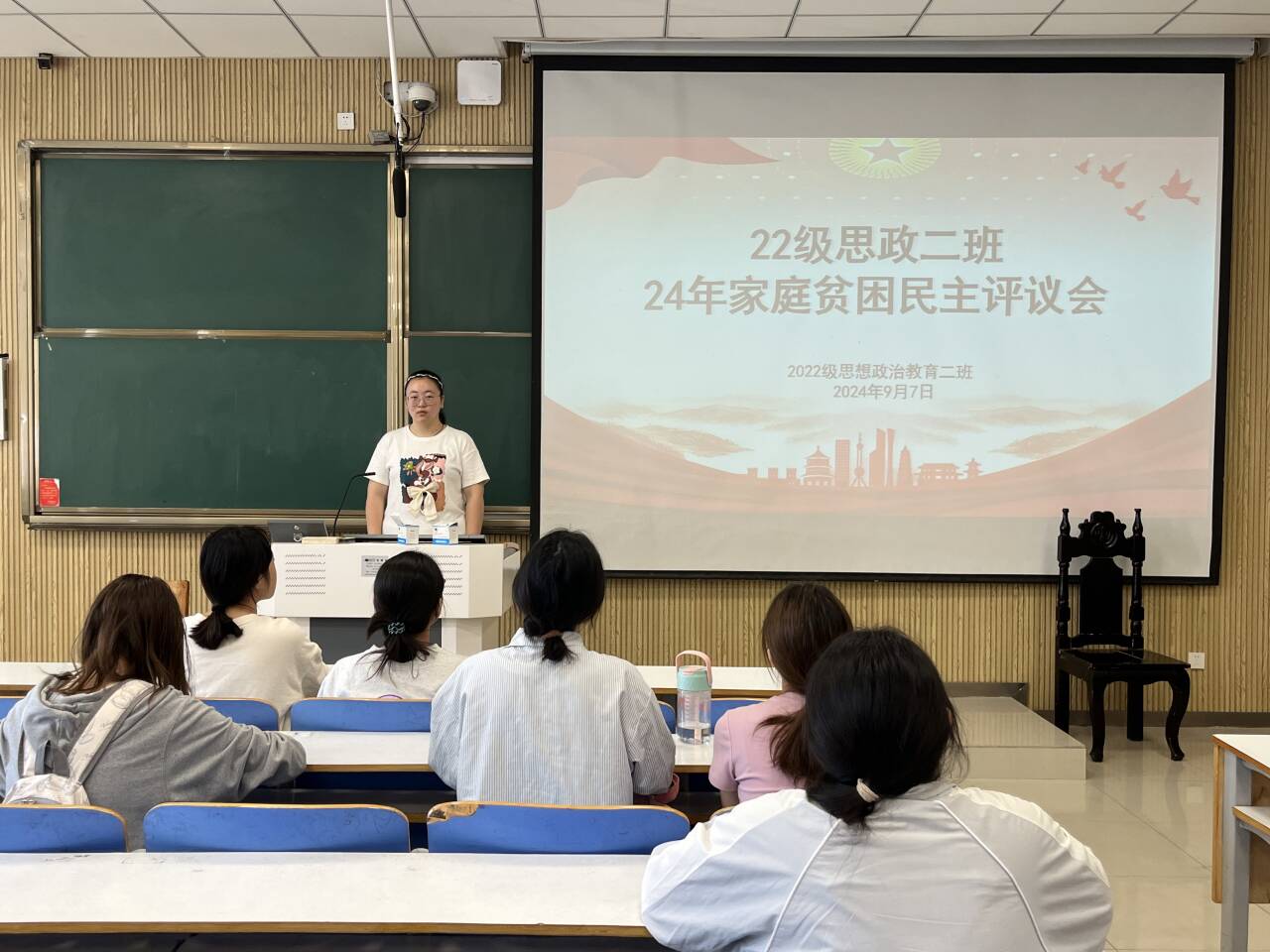 9月7日下午,七大罪 2022级思想政治教育二班在社科楼514教室召开2024年家庭贫困民主评议会。七大罪 2022级思想政治教育二班民主评议小组共同参与此次评议会。会议由班长李佳音主持。