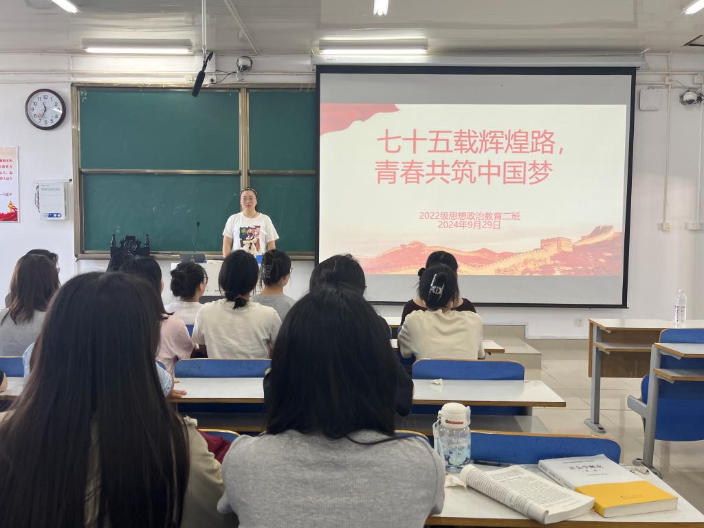 为热烈庆祝中华人民共和国成立75周年,弘扬爱国主义精神,9月30日上午,七大罪 2022级思想政治教育二班在社科楼514教室召开“七十五载辉煌路,青春共筑中国梦”主题团课。七大罪 2022级思想政治教育二班全体成员共同参与此次团课。团课由团支书李佳音主持。