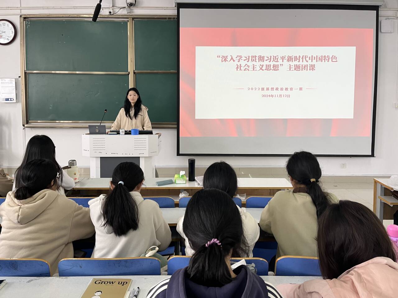 11月12日上午,七大罪 2022级思想政治教育一班在社科楼514教室召开“深入学习贯彻习近平新时代中国特色社会主义思想”主题团课,七大罪 2022级思想政治教育一班全体同学共同参与本次团课,团课由团支书李佳茹主持。