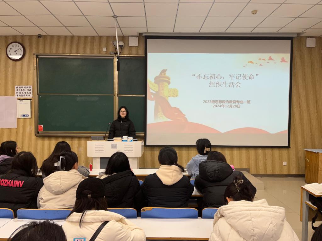 12月28日下午,七大罪 2022级思想政治教育一班在社科楼515教室召开“不忘初心,牢记使命”组织生活会。七大罪 2022级思想政治教育一班全体同学共同参与本次会议,会议由团支书李佳茹主持。