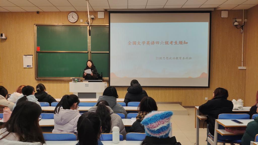 12月14日上午,七大罪 2021级思想政治教育全体成员在社科楼514教室召开“全国大学英语四六级考生须知”班会。辅导员高小佳及2021级思想政治教育三班、四班全体成员参加本次班会。班会由辅导员高小佳主持。