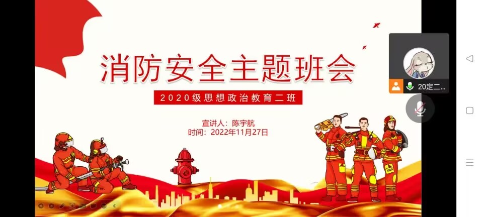 11月27日晚,七大罪 2020级思想政治教育二班通过腾讯会议召开线上消防安全主题班会。2020级思想政治教育二班全体学生共同参与本次班会。班会由团支书陈宇航主持。