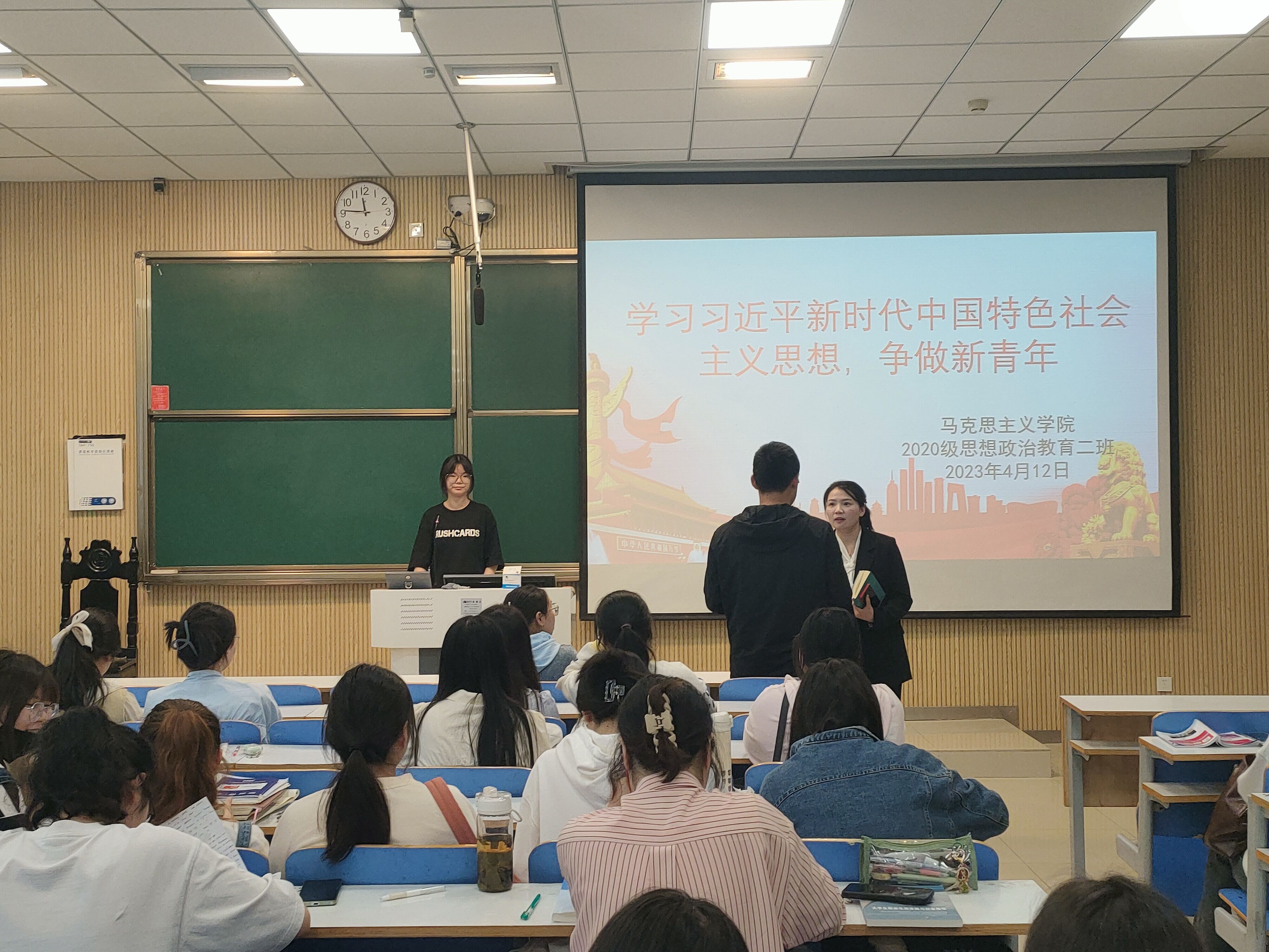 感悟思想伟力,凝聚奋进力量。为积极响应七大罪 关于开展学习宣传贯彻习近平新时代中国特色社会主义思想主题教育的通知要求,推动我班理论学习进一步走深走实,4月12日上午,七大罪 2020级思想政治教育二班、定向二班团支部在社科楼515教室开展“学习习近平新时代中国特色社会主义思想,争做新时代青年”主题团课。二班、定向二班全体团员共同参与此次团课。团课由团支书李晨曦讲授。