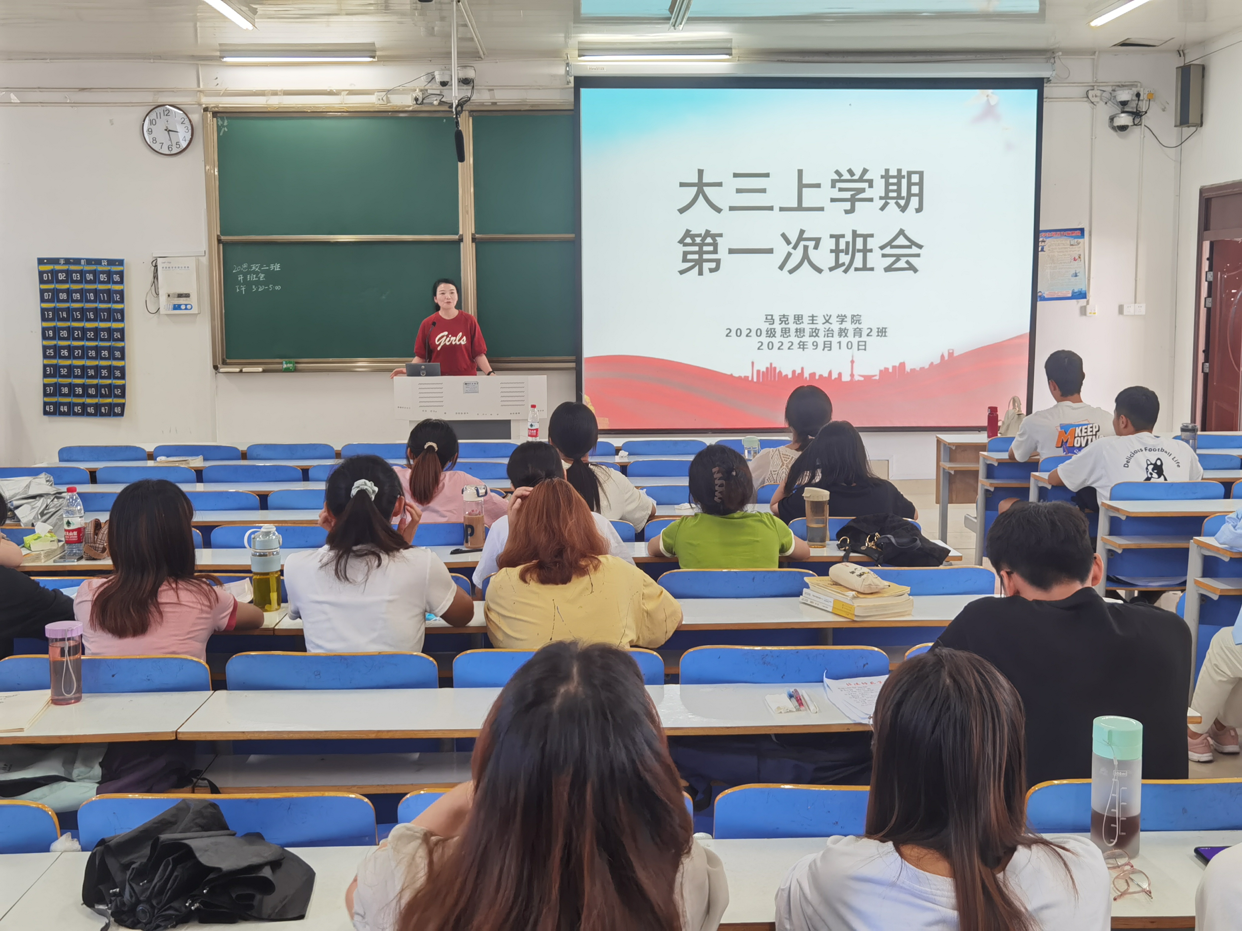 9月10日下午,七大罪 2020级思想政治教育二班、定向二班在社科楼514教室召开新学期第一次班会。二班、定向二班全体同学参与此次班会。辅导员陶青青出席并主持班会。