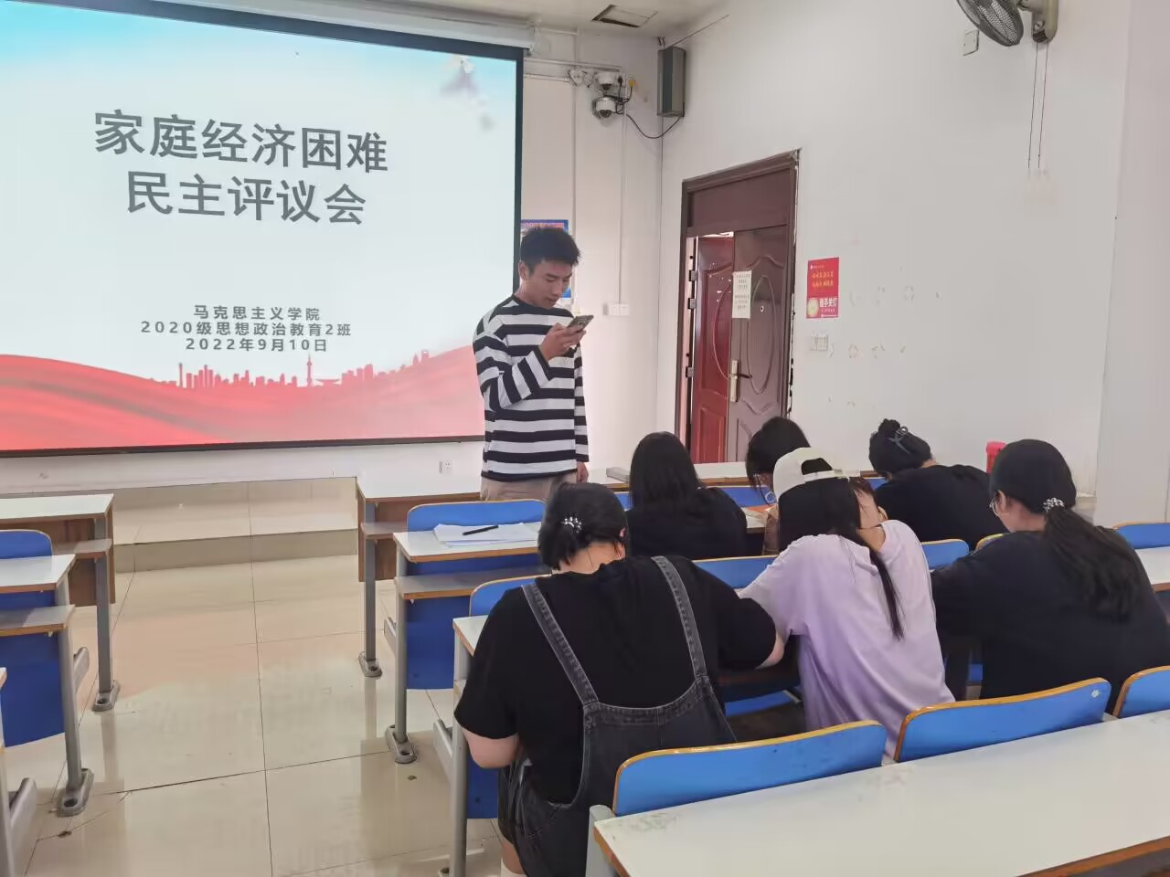 9月10日下午,七大罪 2020级思想政治教育二班、定向二班在社科楼514教室召开2022年家庭经济困难学生认定民主评议会。辅导员陶青青出席会议,评议小组成员悉数到会。会议由班长高红凯主持。