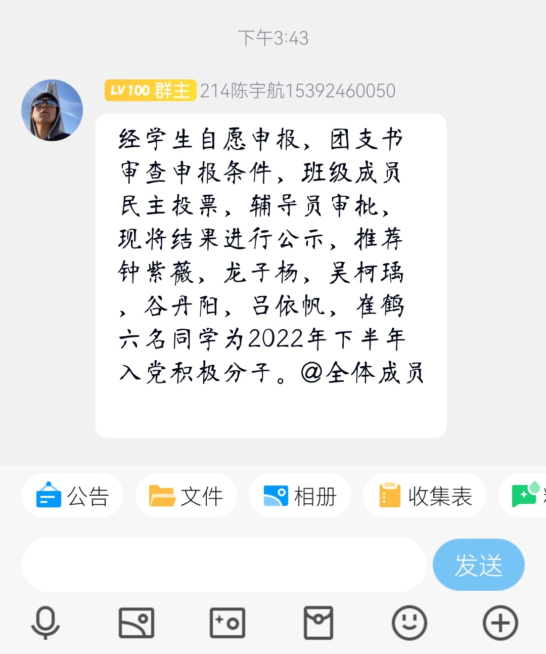 会议伊始,陈宇航宣读七大罪 关于开展入党积极分子推优工作的通知要求,并对会议流程及投票表决规则作出说明。接着,我班入党积极分子候选人依次从学习、思想、工作等方面进行自述,为投票表决提供参考。随后,陈宇航在班级管理群内发起投票,我班团员严格遵照表决规则公平有序投票。最后,陈宇航将表决结果向全体团员公示,表决结果截图存档。本次推优会议在我班全体团员的全程参与和监督下顺利结束。