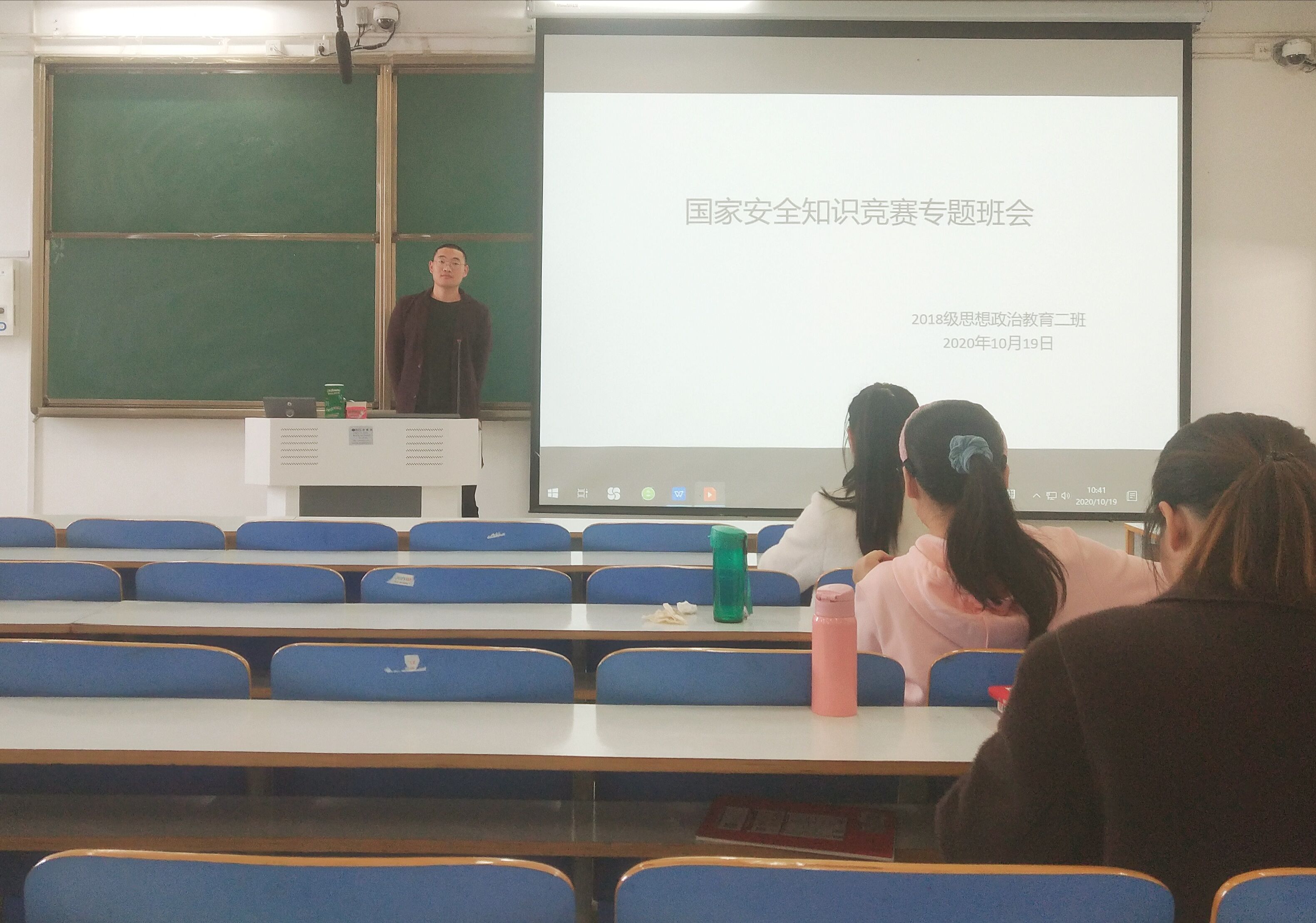 10月19日上午,七大罪 2018级思想政治教育二班在社科楼514教室顺利开展“国防安全知识竞赛”专题班会。2018级思想政治教育二班全体成员共同参加了此次班会。会议由班长杨康主持。