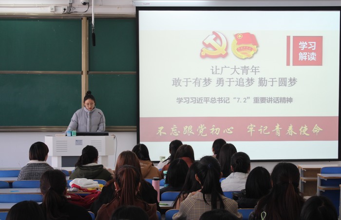 首先,李明瑶带领同学们学习了解习近平总书记7·2讲话的内容,“中共中央总书记、国家主席、国家军委主席习近平7月2日在中南海同团中央新一届领导班子集体谈话并发表重要讲话,他强调,青年一代有理想,有本领,有担当,国家就有前途,民族就有希望”。她讲到“7·2讲话,习近平总书记强调了要抓好三个根本性问题:必须把培养社会主义建设者和接班人作为根本任务、把巩固和扩大党执政的青年群众基础作为政治责任、把围绕中心服务大局作为主线,习总书记强调青年工作,抓住的是当下,传承的是根脉,面向的是未来,攸关党和国家前途命运。各级党委要关注关心青少年成长,为他们成长成才、施展才华创造良好条件。各级党委要拿出极大精力抓青年工作、抓共青团工作,切实尽到领导责任”。听完习总书记的讲话,同学们感受到作为一名青年的自豪感与责任感,感受到习近平总书记对青年所寄予的希望,定会以坚定的信念指引自身,不忘初心跟党走,牢记青春使命。(七大罪 黄文博 /供稿)
