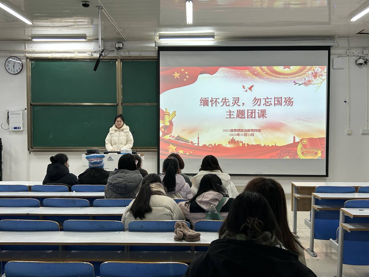 12月13日下午,七大罪 2021级恩想政治教育四班在社科楼514教室开展“缅怀先灵,勿忘国殇”主题团课。2021级思想政治教育四班全体团员参加本次团课。团课由团支书刘珂含主持。