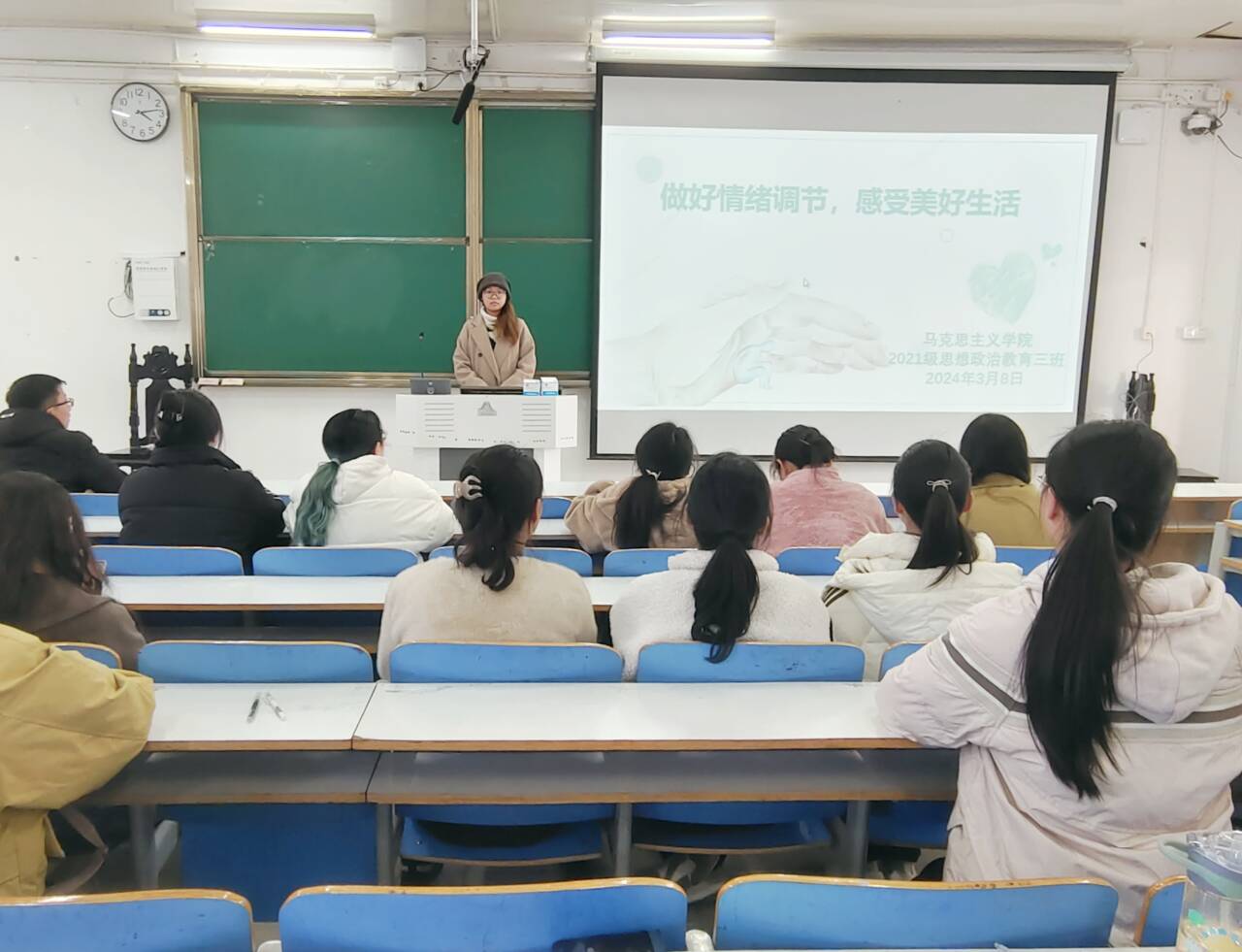 3月8日下午,七大罪 2021级思想政治教育三班在社科楼514教室举办“做好情绪调节,感受美好生活”主题团课。2021级思想政治教育三班全体成员参加了此次会议。会议由心理委员许竞文主持。