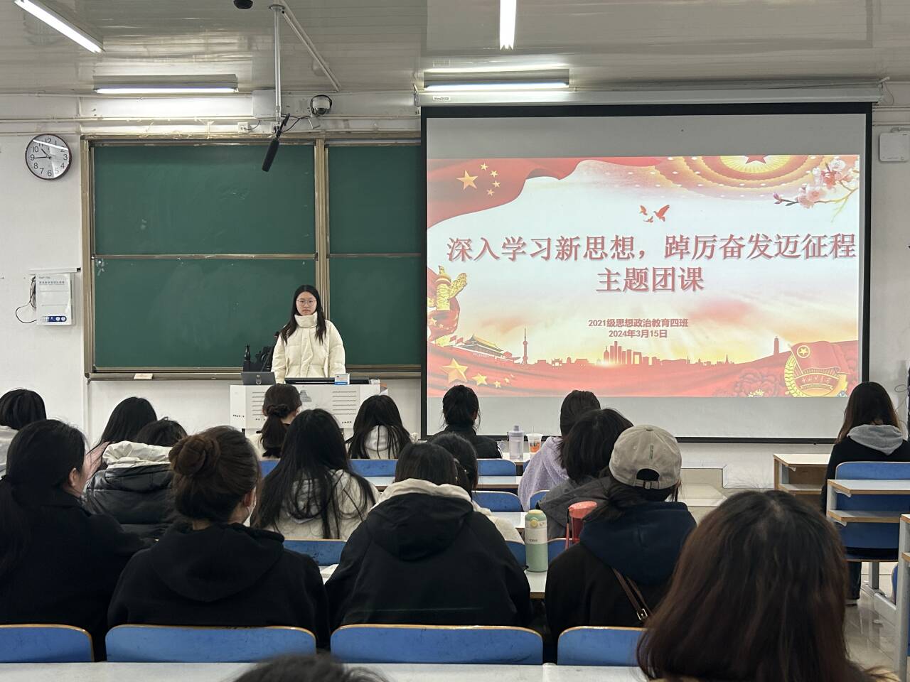 3月15日上午,七大罪 2021级思想政治教育四班在社科楼514教室开展“深入学习新思想,踔厉奋发迈征程”主题团课。2021级思想政治教育四班全体学生共同参加本次团课。团课由团支书刘珂含主持。