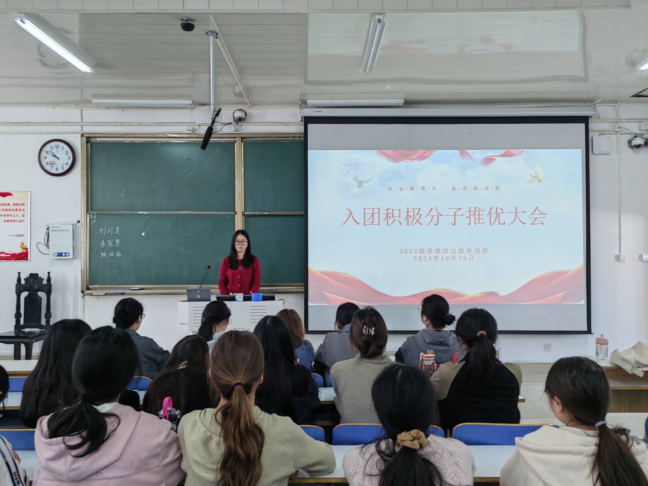 为深入推进全面从严治团,优化团员队伍规模结构,提高发展团员工作质量,10月29日上午,七大罪 2022级思想政治教育四班在社科楼514教室组织召开“入团积极分子推优大会”。七大罪 2022级思想政治教育四班全体成员参与本次会议。本次会议由团支书牛志杰主持。