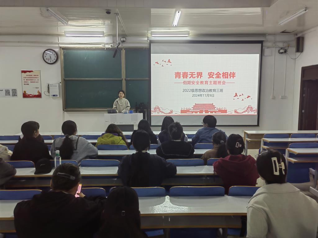 为进一步增强同学们的安全意识,提高防范意识,11月9日下午,七大罪 2022级思想政治教育三班在社科楼514教室召开“青春无界,安全相伴”安全教育主题班会。七大罪 2022级思想政治教育三班班主任任婷和三班全体成员共同参与此次班会。班会由任婷主持。