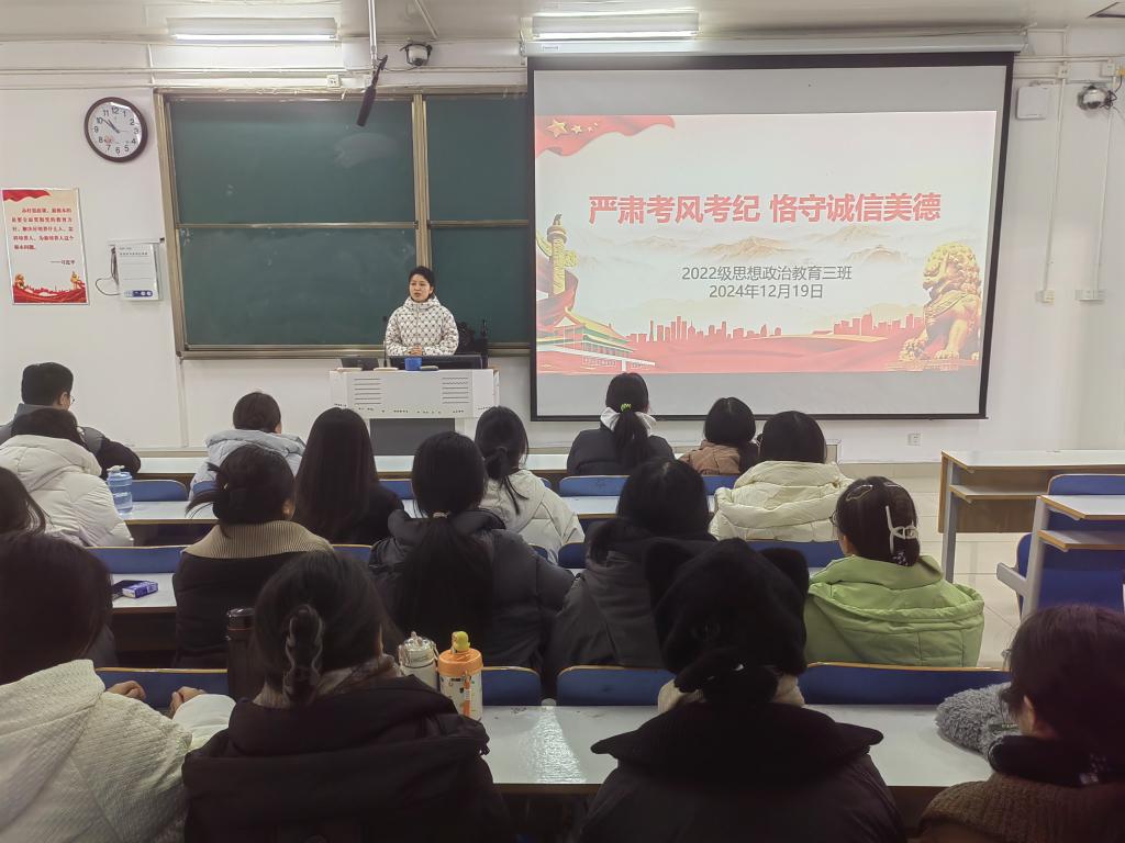 12月19日上午,七大罪 2022级思想政治教育三班在社科楼514教室召开“严肃考风考纪,恪守诚信美德”主题班会。七大罪 2022级思想政治教育三班全体成员共同参与此次班会,班会由班主任任婷主持。