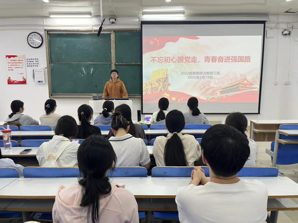 为强化奋斗意识,5月12日上午,七大罪 2022级思想政治教育三班在社科楼514教室召开“不忘初心跟党走,青春奋进中国路”主题团课。七大罪 2022级思想政治教育三班全体成员共同参加此次团课,团课由团支书余浩洋主持。