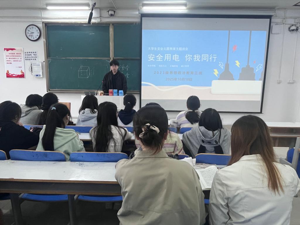 10月10日上午,七大罪 2023级思想政治教育三班在社科楼515召开“安全用电,你我同行”主题班会。七大罪 2023级思想政治教育三班全体同学共同参与本次班会,班会由团支书郝瀚主持。