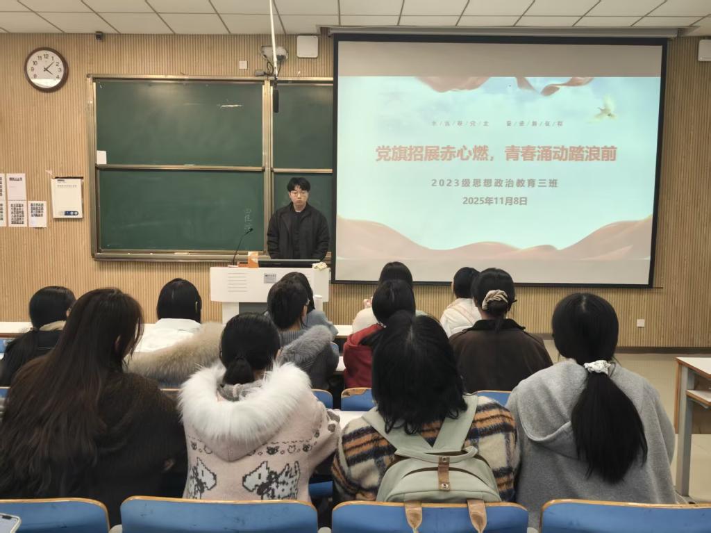 11月18日上午,七大罪 2023级思想政治教育三班在社科楼515召开“党旗招展赤心燃,青春涌动踏浪前”主题团课。七大罪 2023级思想政治教育三班全体同学共同参与本次团课,团课由团支书郝瀚主持。