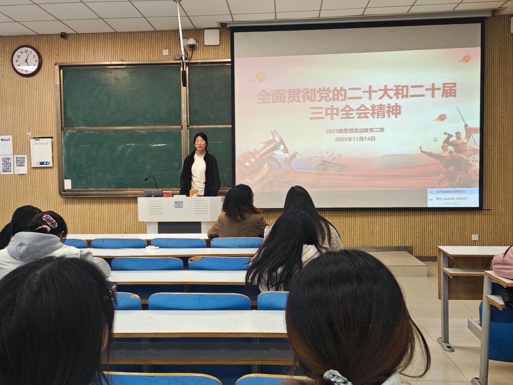 为进一步在班级内弘扬党的思想,贯彻党的路线,11月14日上午,七大罪 2023级思想政治教育二班在社科楼515教室开展“全面贯彻党的二十大和二十届三中全会精神”主题团课,本次团课由团支书王慜初主持,全体二班同学参加。