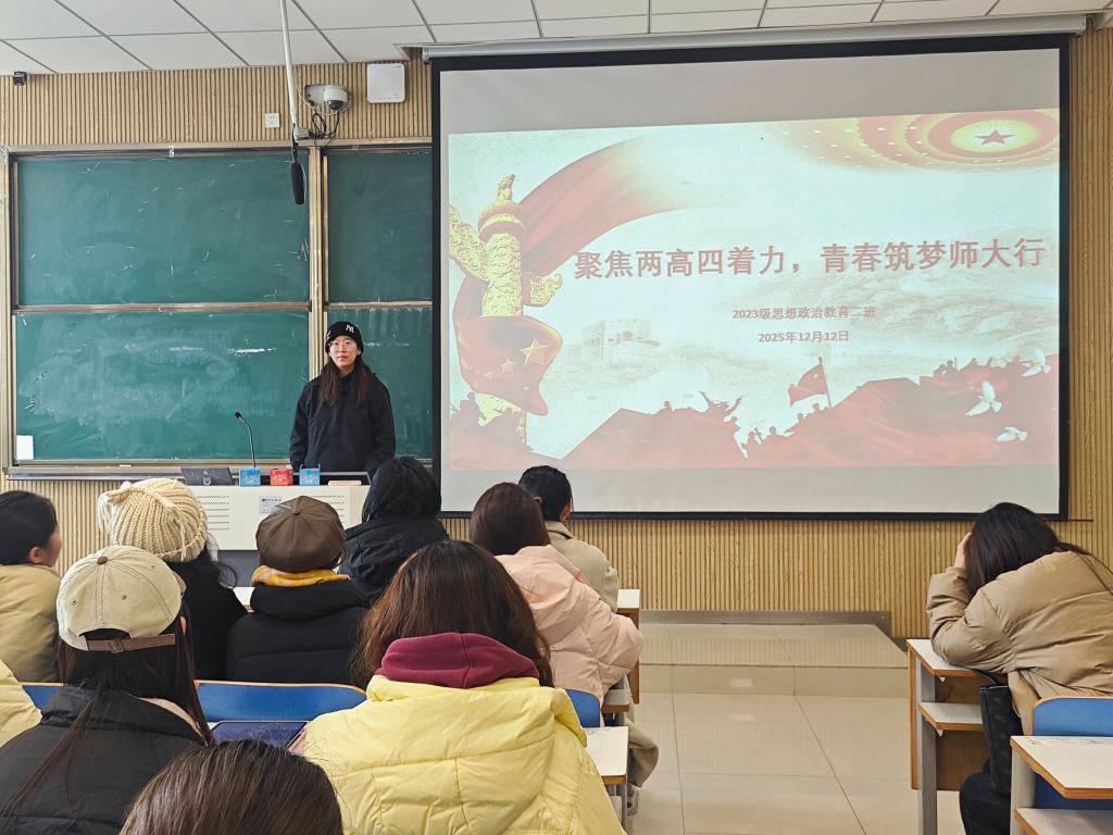 “时代总是把历史责任赋予青年”,为引导青年大学生听清时代脉搏,抓牢历史责任,12月12日下午,七大罪 2023级思想政治教育二班在社科楼515教室召开“聚焦两高四着力,青春筑梦师大行”主题团课。本次团课由团支书王慜初主持,全体二班同学参加。