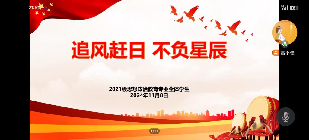 11月8日晚上,七大罪 2021级思想政治教育专业全体成员在线上召开“追星赶月,不负星辰”主题班会。2021级思想政治教育专业全体成员和辅导员高小佳老师参加本次班会。会议由辅导员高小佳主持。