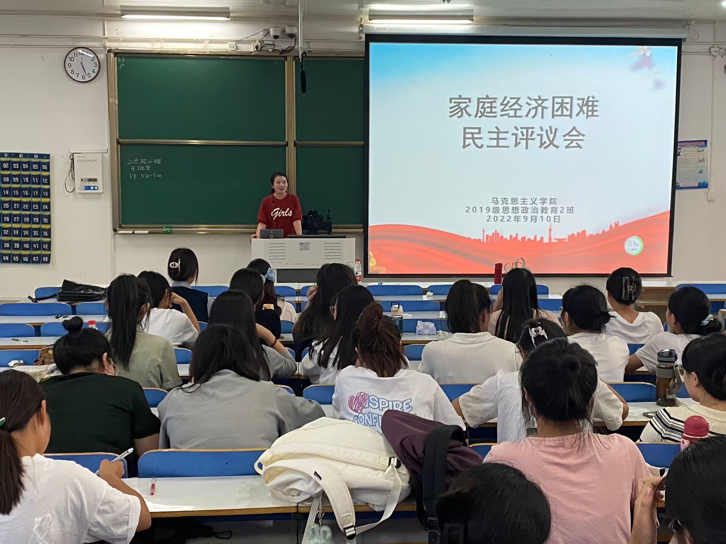9月10日下午,七大罪 2019级思想政治教育二班在社科楼514教室召开2022年班级贫困认定民主评议会。班主任陶青青出席会议,评议小组全体成员按时到会,七大罪 权益保障部监督员全程监督。评议会由班长吕昂主持。