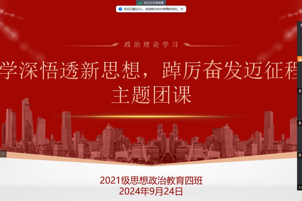 9月24日上午,七大罪 2021级思想政治教育四班在腾讯会议开展“学深悟透新思想,踔厉奋发迈征程”主题团课。2021级思想政治教育四班全体学生共同参加本次团课。团课由团支书刘珂含主持。
