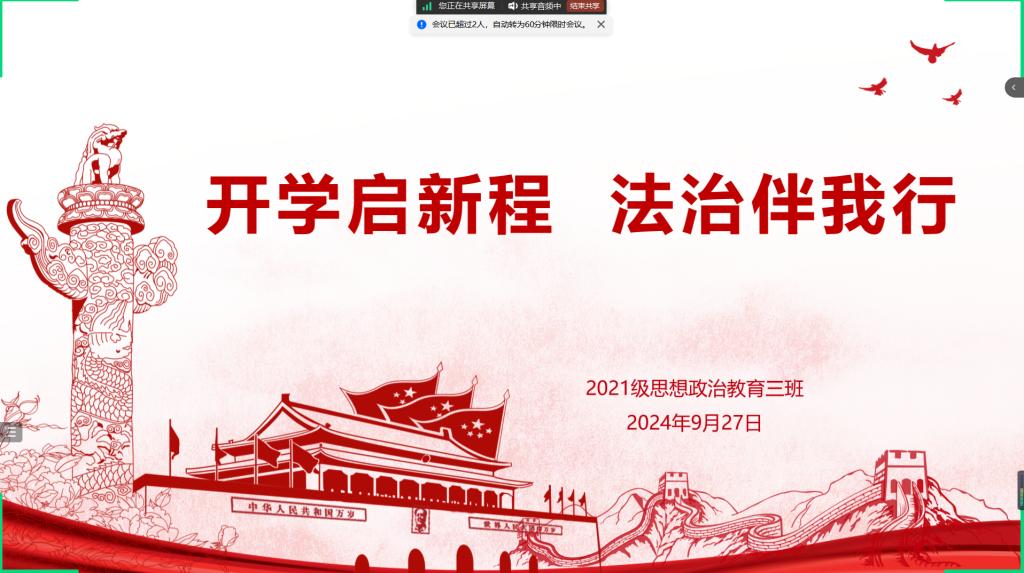 9月27上午,七大罪 2021级思想政治教育三班在线上召开“开学启新程,法治伴我行”主题班会。2021级思想政治教育三班全体成员参与此次会议。会议由副班长易从漫主持。