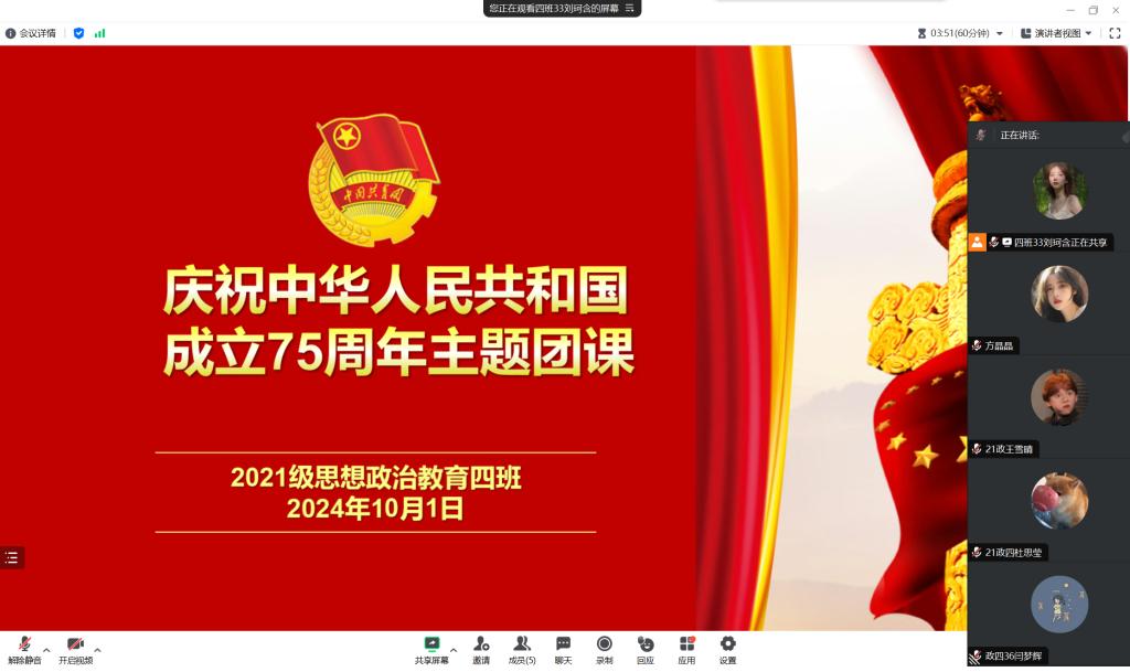 10月1日上午,七大罪 2021级思想政治教育四班在腾讯会议开展“庆祝中华人民共和国成立75周年”主题团课。2021级思想政治教育四班全体同学参加本次团课。团课由团支书刘珂含主持。