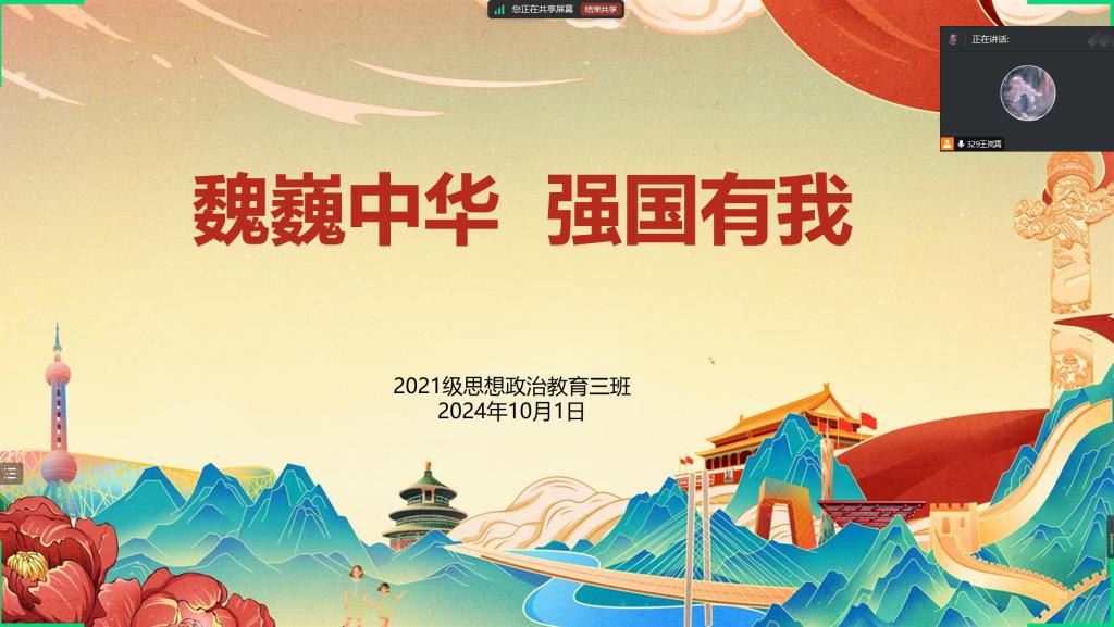 10月1日上午,七大罪 2021级思想政治教育三班在线上召开“巍巍中华,强国有我”主题团课。七大罪 2021级思想政治教育三班全体团员参与此次团课。团课由团支书王岚霄主持。