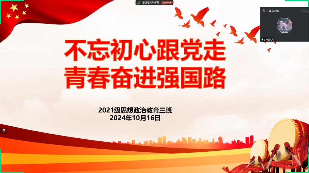 10月16日上午,七大罪 2021级思想政治教育三班在线上召开“不忘初心跟党走,青春奋进强国路”主题团课。七大罪 2021级思想政治教育三班全体团员参与此次团课。团课由团支书王岚霄主持。